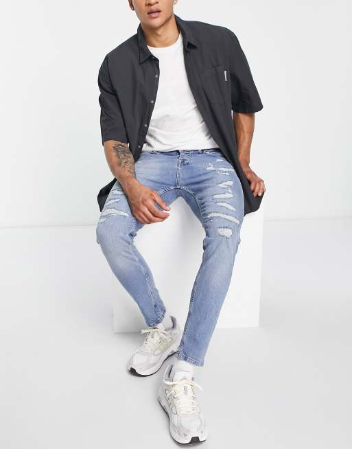 Topman – Blå stretch jeans i mellanljus tvätt med revor och lagningar i avsmalnande modell