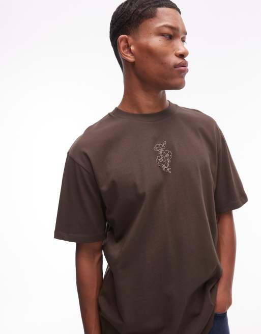 Topman – Brun, avslappnad t-shirt med blombroderi