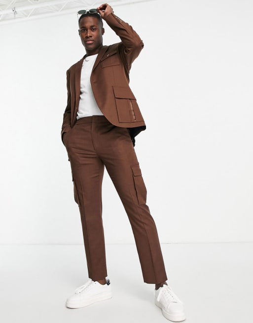 Topman – Brun smal kostym med kavaj och cargobyxor
