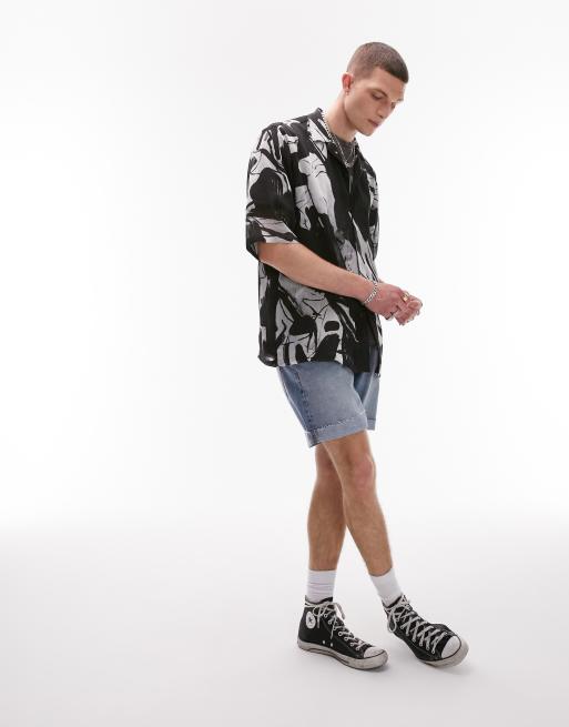 Topman – Flerfärgad, skir, avslappnad skjorta med korta ärmar, platt krage och abstrakt mönster