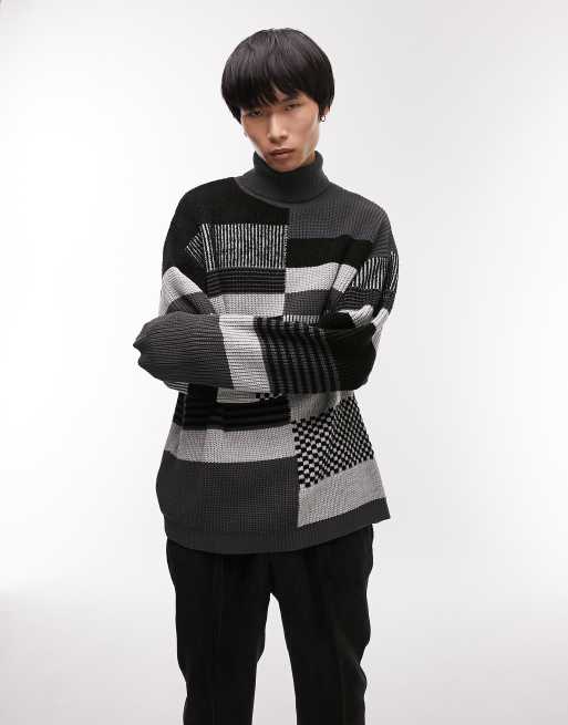 Topman – Grå stickad tröja i oversize med polokrage och lappat mönster