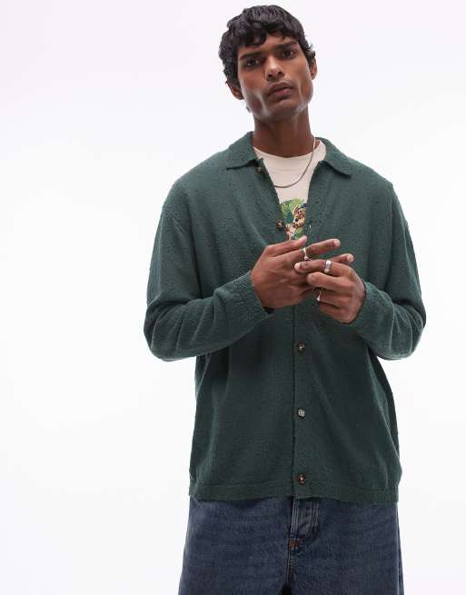 Topman – Grön, texturstickad skjorta med knäppning och avslappnad passform