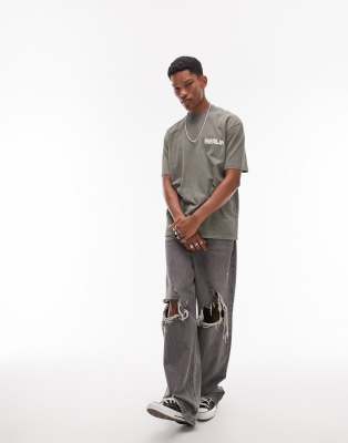 Topman – Kakifärgad t-shirt i oversize med slitna detaljer och Berlin-tryck