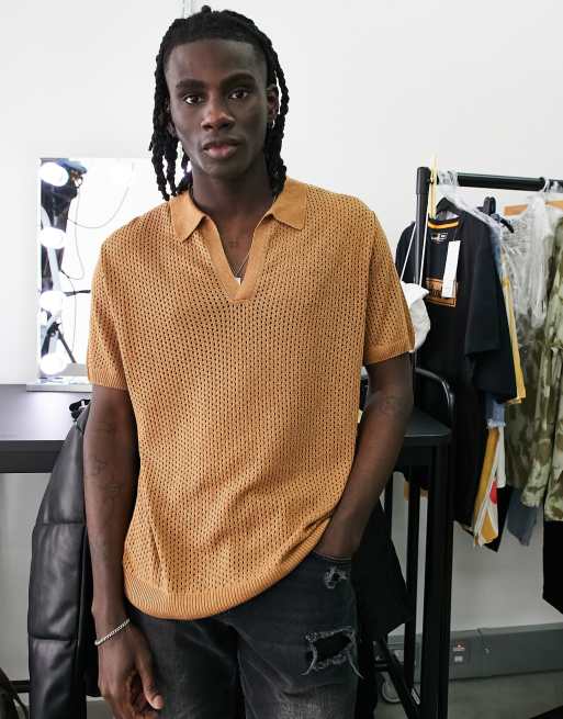 Topman – Ljusbrun stickad pikétröja i mesh med platt krage