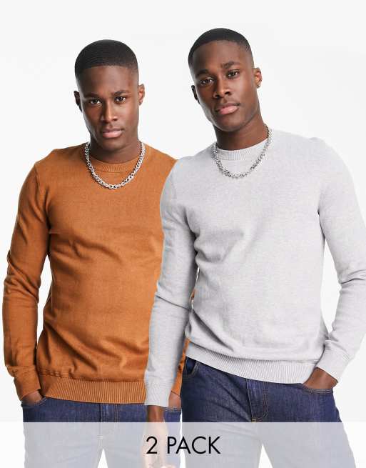 Topman – Ljusbruna och grå, stickade tröjor med rund halsringning och långa ärmar i flerpack