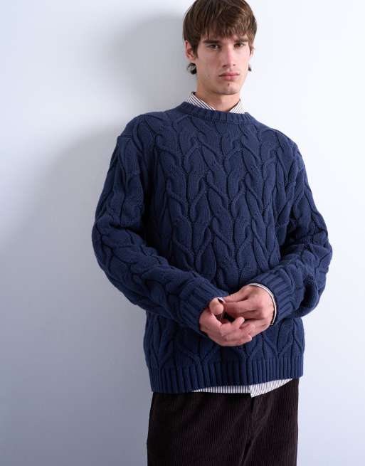 Topman – Marinblå, kraftig, flätstickad, avslappnad tröja