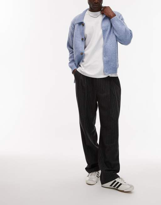 Topman – Premium – Mörkgrå, kritstrecksrandiga byxor i yllemix med vida ben