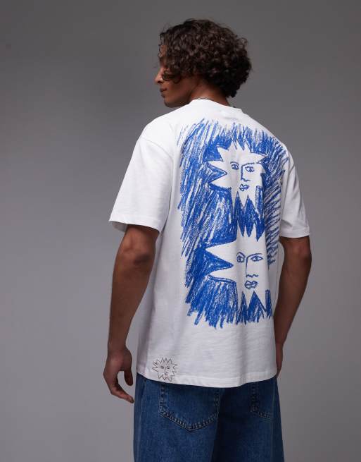 Topman – Premium – Vit, avslappnad t-shirt med broderi och soltryck i skissad stil fram- och baktill