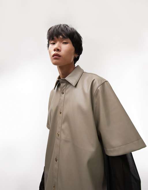 Topman – Stenfärgad läderimitation skjorta med kort ärm