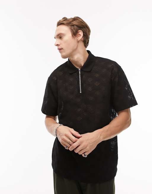 Topman – Svart oversize pikétröja i mesh med diamantformat mönster