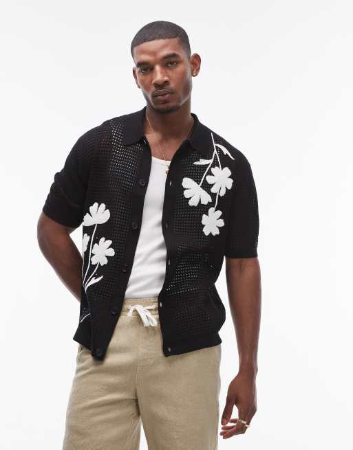 Topman – Svart stickad skjorta med knäppning och vit applikation