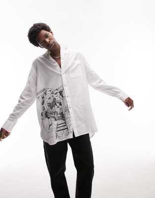 Topman – Vit, långärmad skjorta i extra oversize med broderad fåll