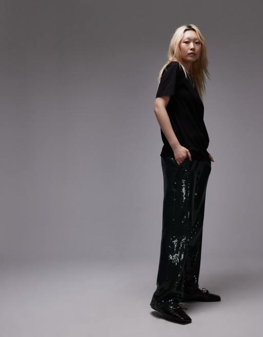 Topshop Petite – Gröna, figursydda byxor med paljetter