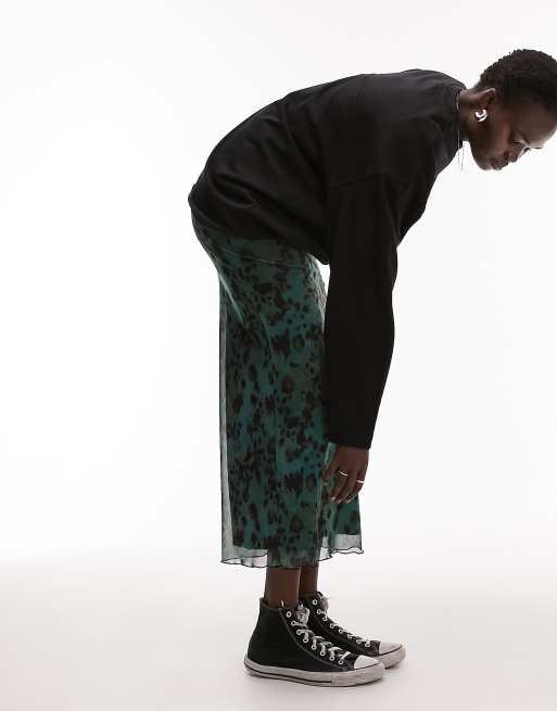 Topshop Tall – Mörkgrön blommig midikjol i mesh