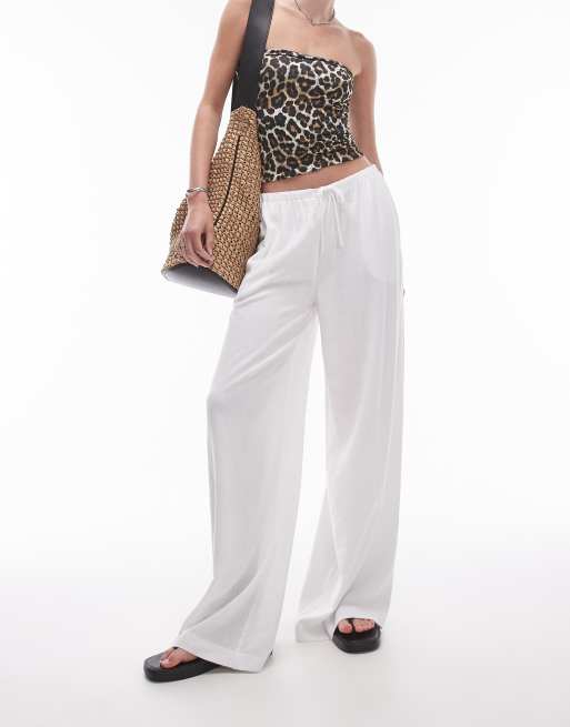 Topshop Tall – Vita linnebyxor med vida ben och knytning i midjan