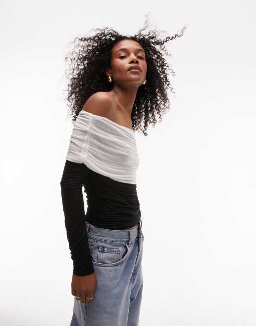 Topshop – Beige, blockfärgad och skir bardot-topp med långa ärmar