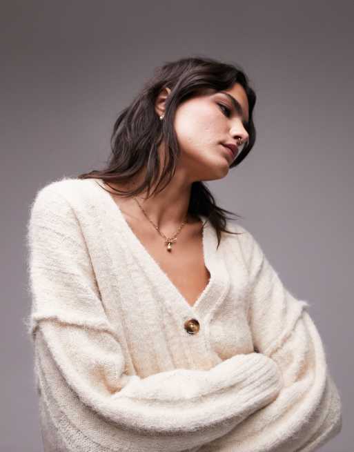 Topshop – Benvit, fluffigt stickad kofta i oversize med v-ringning