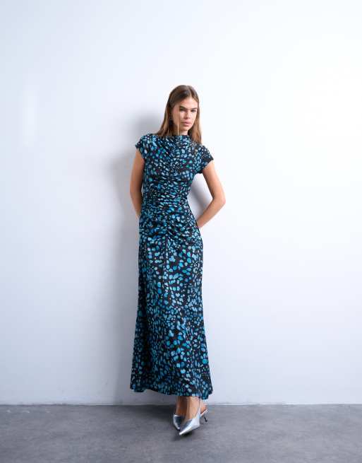 Topshop – Blå, djurmönstrad maxiklänning med holkärmar och rysch
