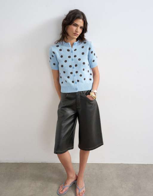 Topshop – Blå, prickig, stickad kofta med korta ärmar
