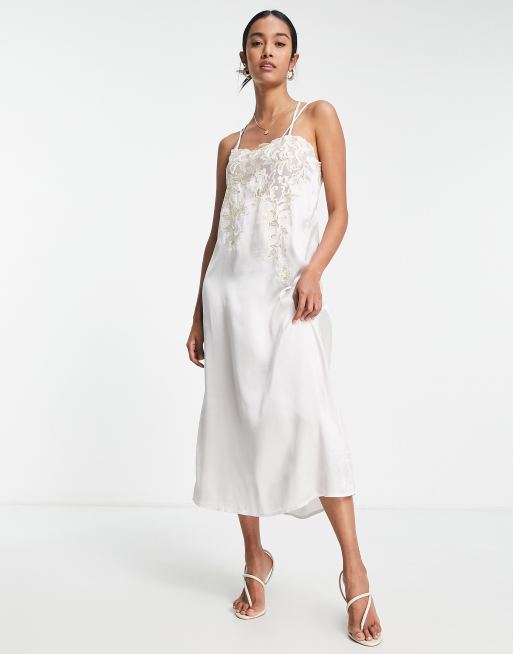 Topshop – Blå slipklänning av satin i midilängd med spetsinfällningar