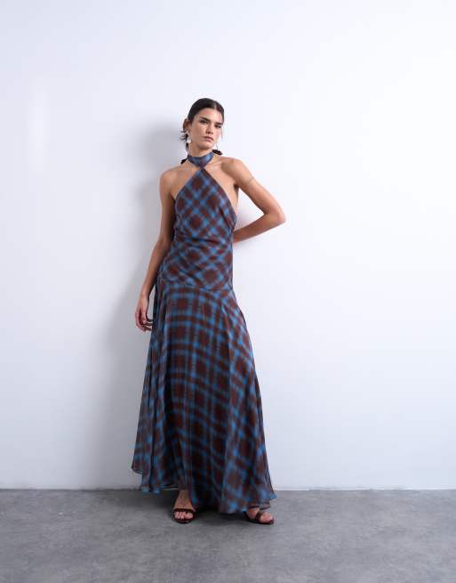 Topshop – Blårutig maxiklänning i chiffong med volymfåll och sänkt midja