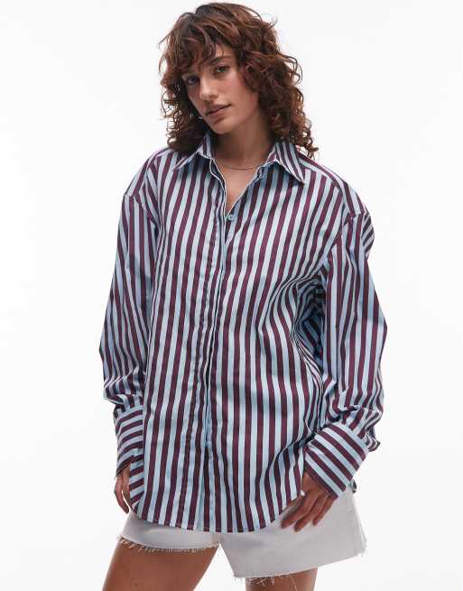 Topshop – Blekblå och vinröd, randig, lång poplinskjorta i extra oversize