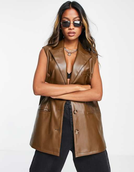 Topshop – Brun ärmlös kavaj i läderimitation