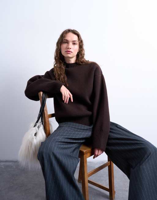 Topshop – Brun, grovstickad tröja med stilren design och rund halsringning