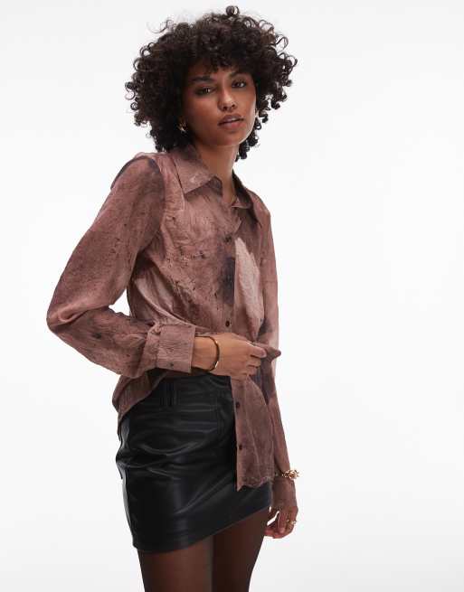 Topshop – Brun, spraymönstrad, strukturerad, diagonalskuren skjorta