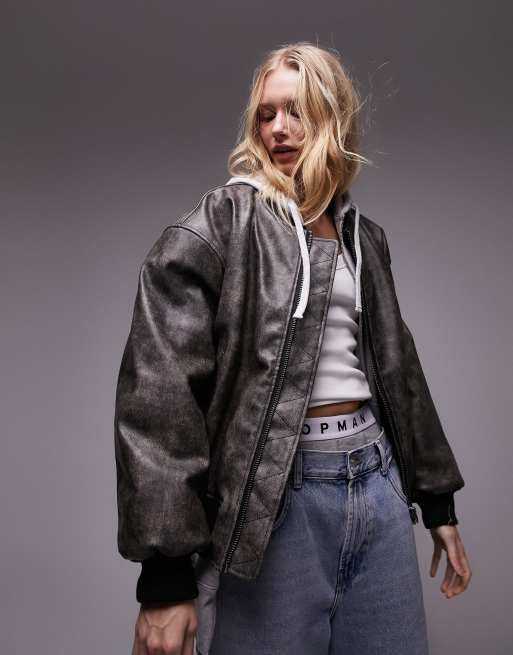 Topshop – Brun, urtvättad bomberjacka i läderimitation