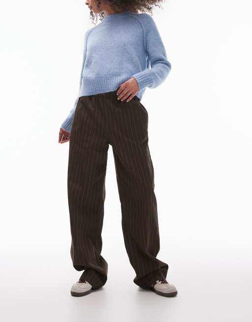 Topshop – Chokladbruna, randiga byxor med resårmidja och raka ben