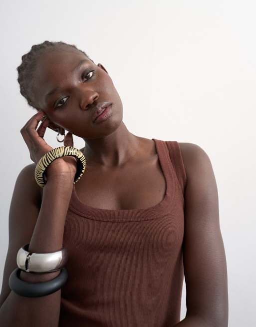 Topshop – Chokladbrunt, ribbat linne med djup halsringning