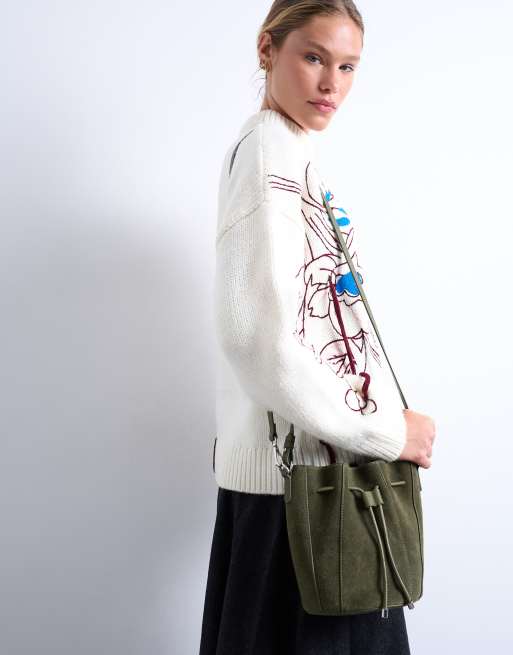 Topshop – Colette – Kakifärgad hinkväska i äkta mocka