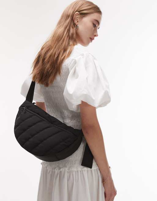 Topshop – Cora – Svart, quiltad axelremsväska i nylon med ficka framtill