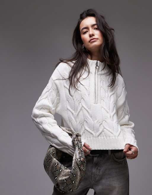 Topshop – Elfenbensvit, flätstickad kofta med hög krage