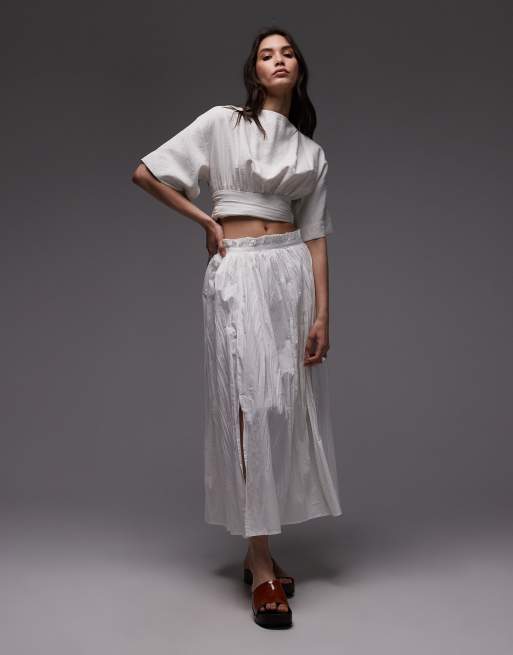 Topshop – Elfenbensvit, krinklad kjol i bomull med vid design