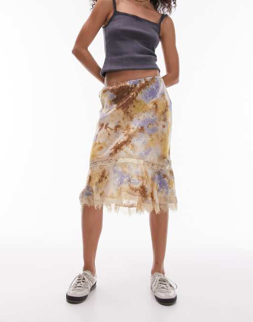 Topshop – Flerfärgad, batikfärgad kjol i 90-talslängd med spetsdetaljer av satin