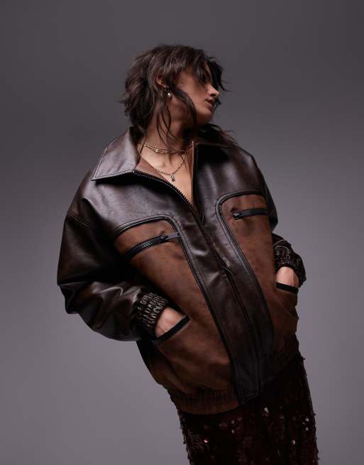 Topshop – Flerfärgad jacka i läderimitation med kontrastfärgad, dekorativ söm