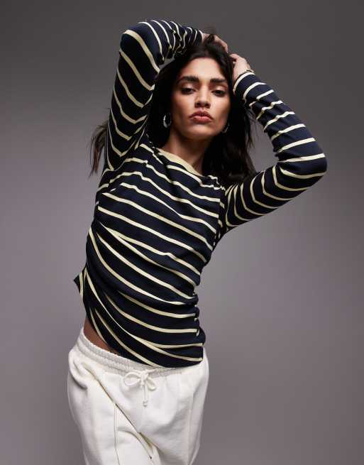 Topshop – Flerfärgad, randig topp med indragning på sidan och långa ärmar
