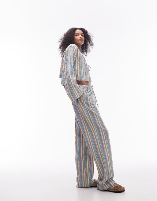 Topshop – Flerfärgade, randiga strandbyxor i bäckebölja med vida ben, del av set