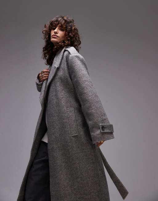 Topshop – Grå, lång, oversize kappa med fiskbensmönster