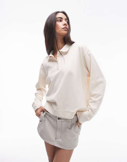 Topshop – Gräddvit, boxig pikétröja med långa ärmar