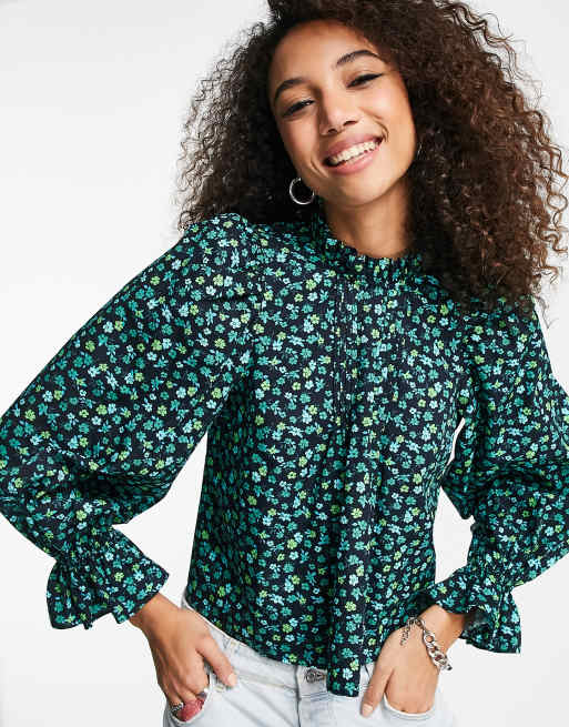 Topshop – Grön, blommig poplin-topp med puffärmar