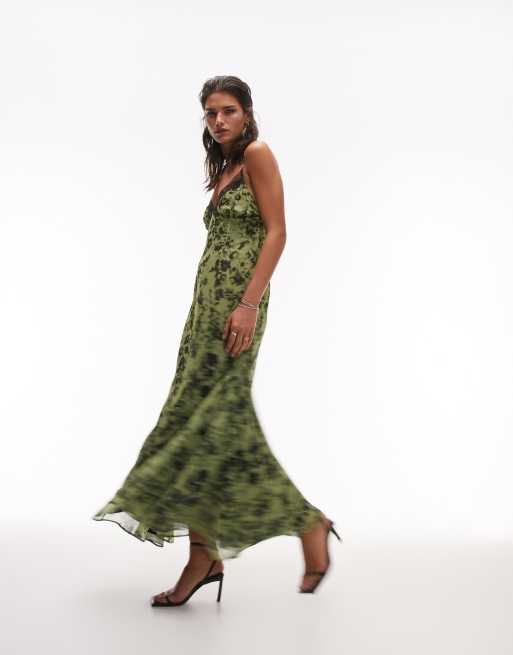 Topshop – Grön, mönstrad slipklänning i maxilängd av chiffong