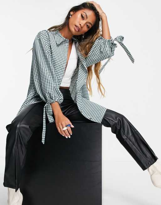 Topshop – Grön och vit skjorta i ginghammönster med avslappnad passform och knytning på ärmen