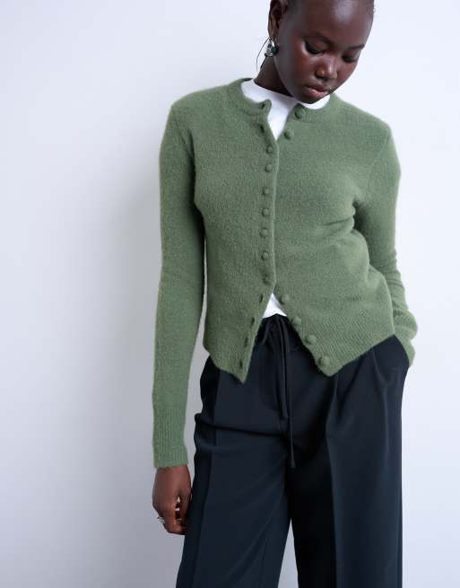 Topshop – Grön, stickad kofta med klädda knappar