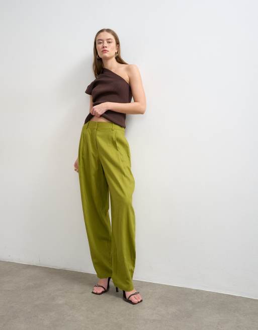 Topshop – Gröna byxor med barrelben i linnemix
