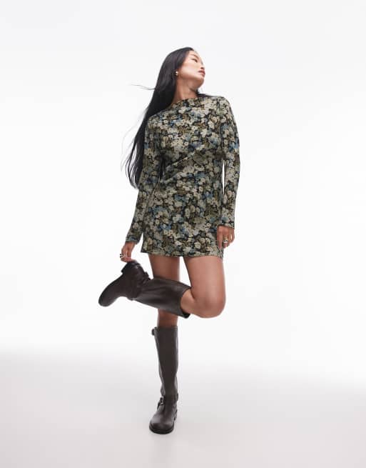 Topshop – Grönblå, blommig, långärmad miniklänning med rak halsringning