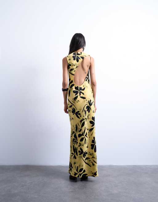 Topshop – Gul, asymmetrisk klänning med öppen rygg och lövmönster