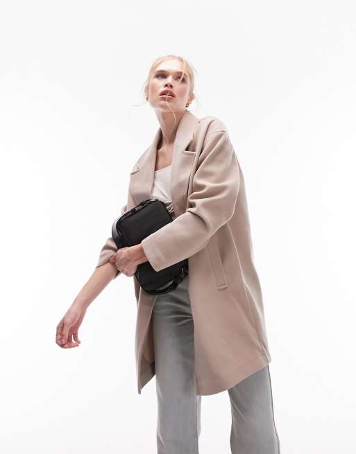 Topshop – Havrefärgad dubbelknäppt kappa i dra på-stil